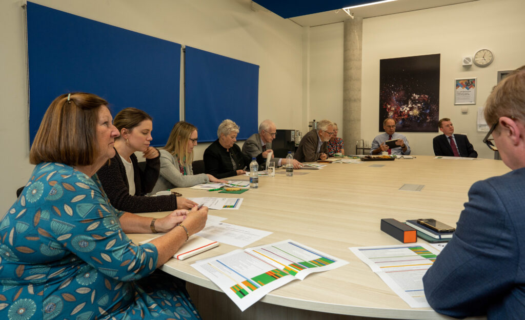 Governors seen meeting with several people sat round a large table in a boardroom.